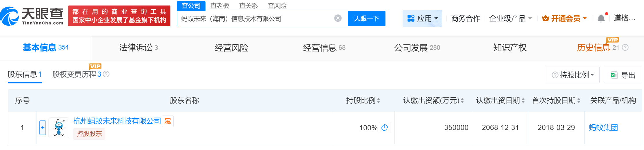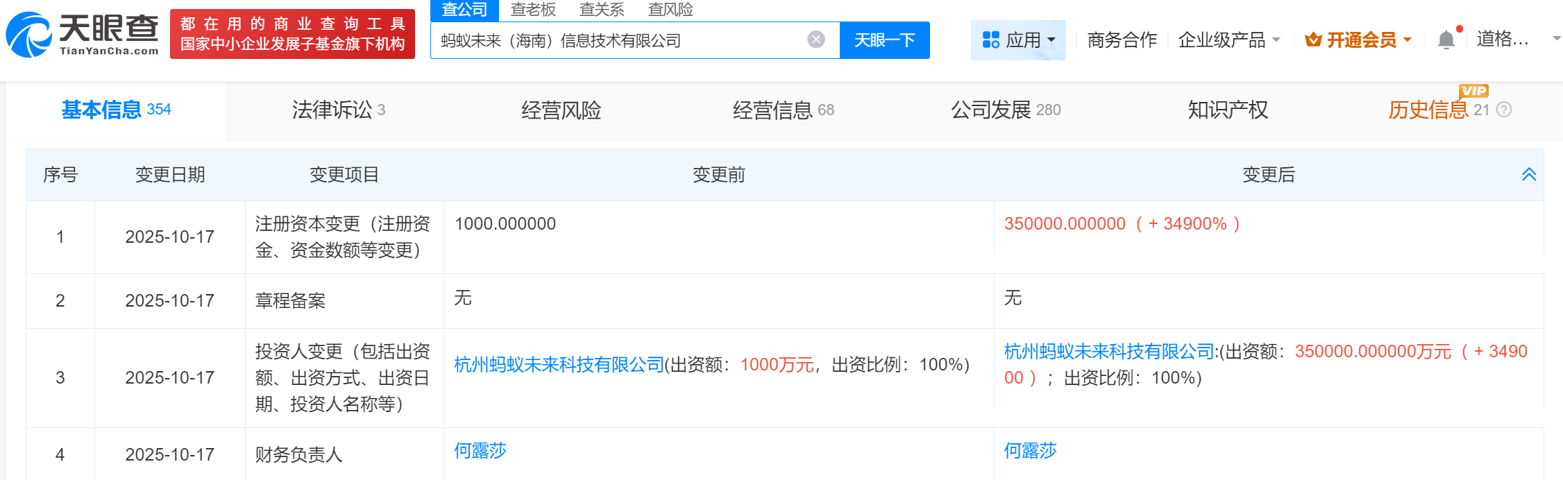 蚂蚁未来海南信息技术公司增资至35亿元 增幅34900%
