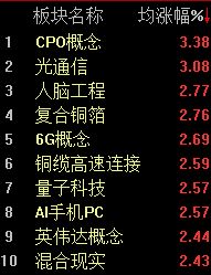 板块方面,F5G概念、CPO概念、光通信模块、煤炭行业等位于涨幅榜前列,贵金属、珠宝首饰、草甘膦等则表现不佳,领跌市场。