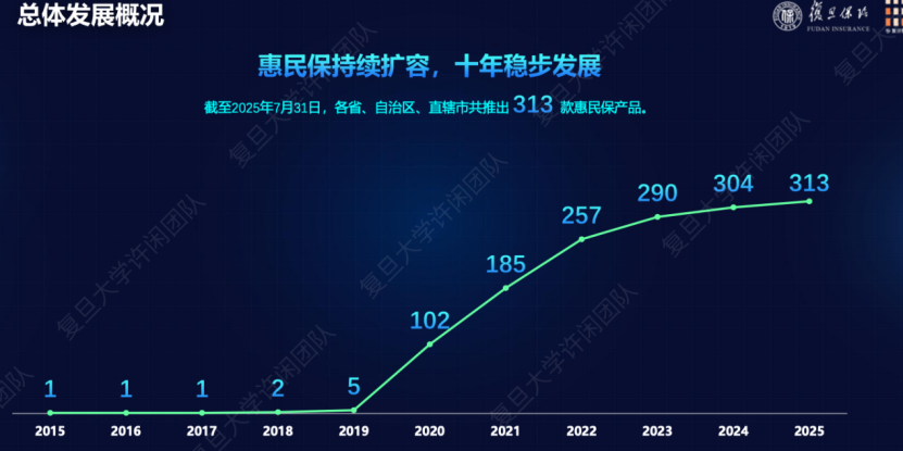 10月18日召开的第五届复旦大学普惠保险与创新论坛上,许闲教授团队发布《2025年城市定制型商业医疗保险(惠民保)知识图谱》(下称报告)显示,2025年新增惠民保产品9款,市场增速为2.96%,较2024年同期进一步放缓。截至7月31日,全国累计推出313款地方性惠民保产品。