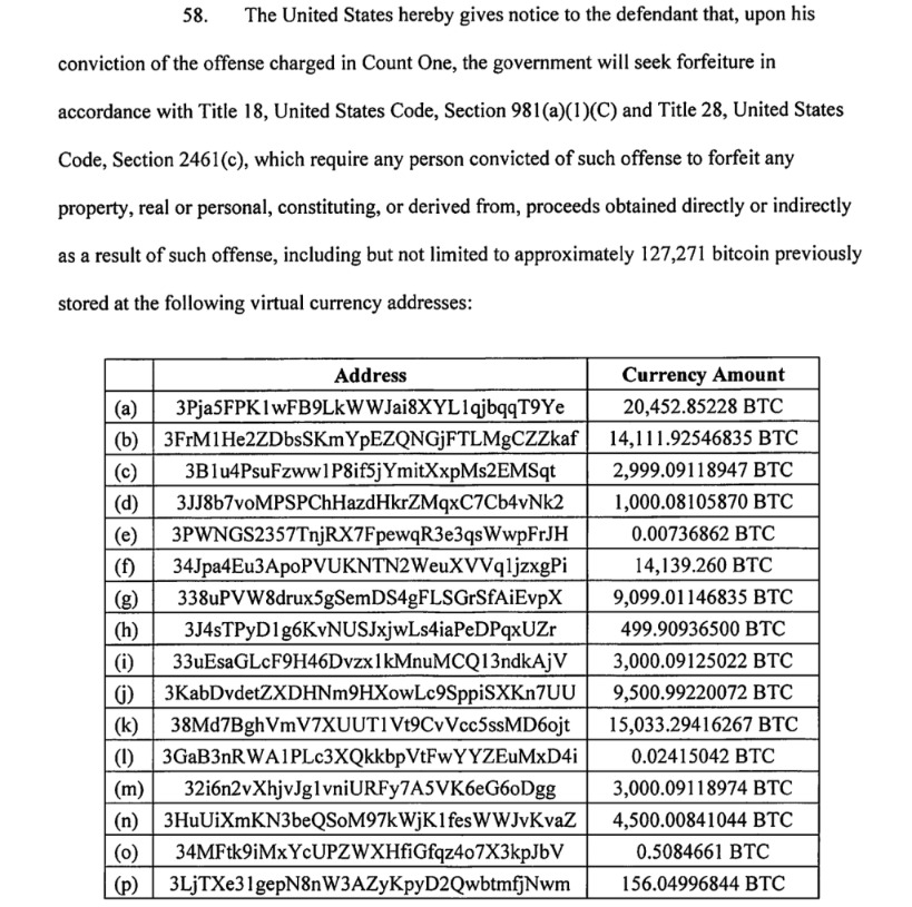 起诉书还指出,大约到2020年,陈志已经积累了大量由诈骗收益转成的加密货币,存储在25个加密货币地址中。起诉书也具体列出了这25个钱包地址及其对应的比特币数量。现在,这些加密货币都存储在由美国政府控制的地址上。