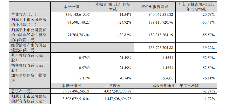 从单季度数据来看,第三季度公司营收3.56亿元,同比增长11.54%,显现出一定的复苏迹象,但第三季度归母净利润7459万元,仍同比下降24.92%。
