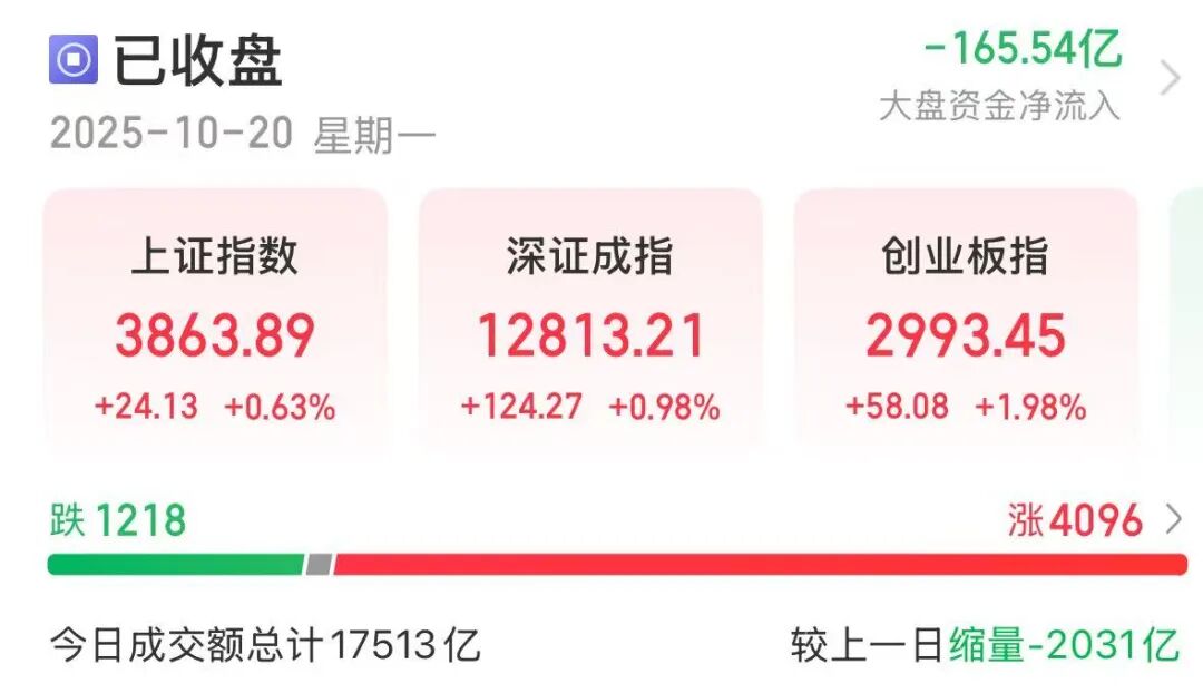 10月20日,A股三大指数盘中上扬,市场积极寻找新的热点。截至收盘,上证指数涨0.63%,深证成指涨0.98%,创业板指涨1.98%。全市场成交额17513亿元,超4000只个股上涨。