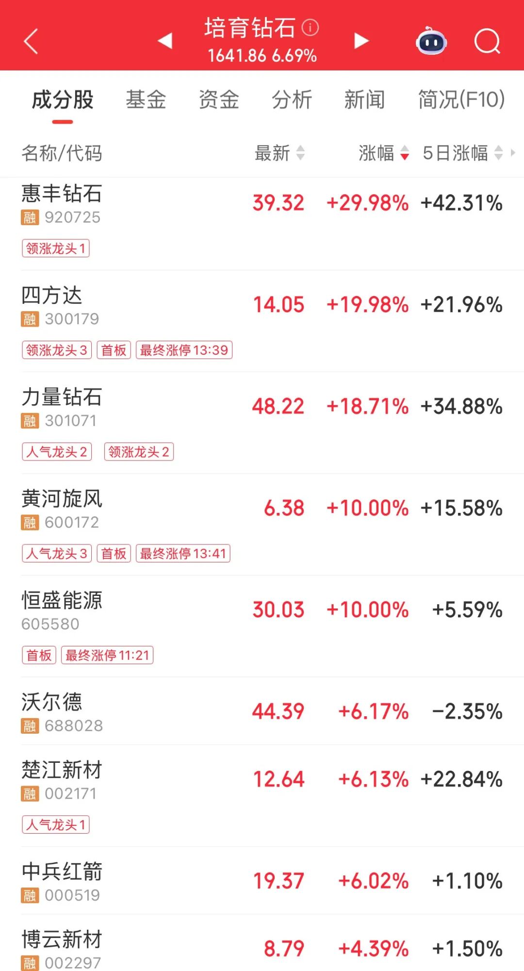 午后,培育钻石板块异动拉升。同花顺数据显示,截至收盘,惠丰钻石“30CM”涨停,四方达“20CM”涨停,力量钻石涨近19%,恒盛能源、黄河旋风涨停。