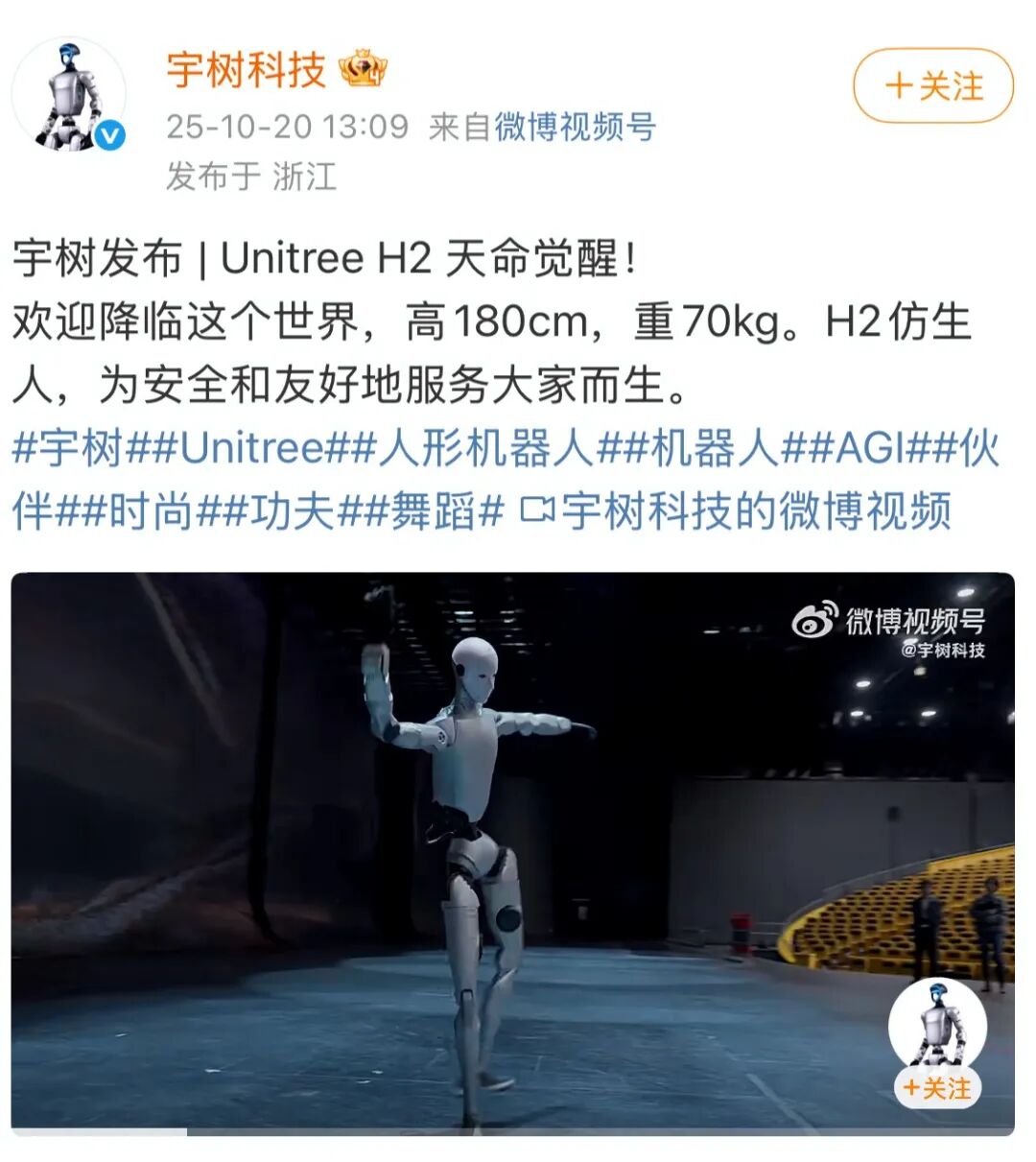 10月20日,宇树科技发布Unitree H2仿生机器人,高180cm,重70kg。