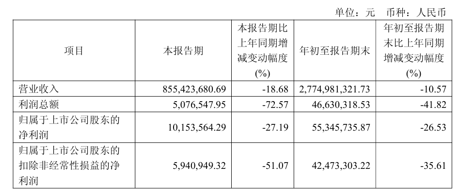 10月20日盘后,嘉环科技(沪市代码:603206)发布2025年第三季度报告。数据显示,该公司前三季度实现营业总收入27.75亿元,同比下降10.57%;归属于上市公司股东的净利润5534.57万元,同比下降26.53%;扣非净利润4247.33万元,同比减少35.61%。