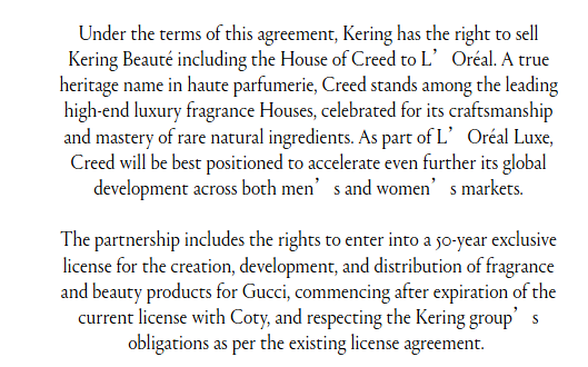10月20日,开云集团在官网宣布,以40亿欧元的价格将美妆业务出售给欧莱雅集团,包括去年才以35亿欧元收购的香水品牌Creed,以及古驰、葆蝶家、巴黎世家等品牌的50年美妆授权许可。本次交易将于2026年上半年完成。