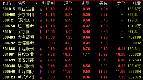 煤炭板块盘中大幅走高,截至收盘,陕西黑猫、安泰集团、郑州煤电、辽宁能源、宝泰隆、大有能源、云煤能源等均涨停。值得注意的是,大有能源近7个交易日已斩获6个涨停板。