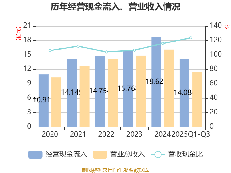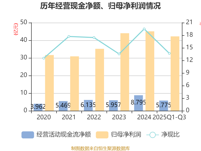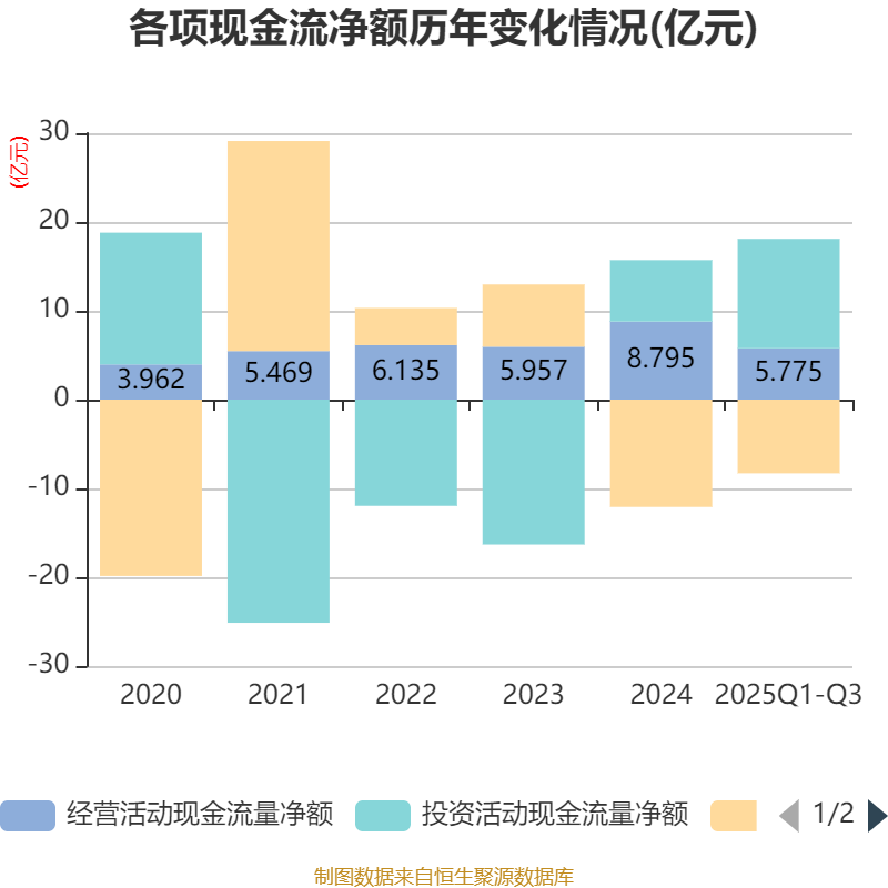 2025年前三季度,公司经营活动现金流净额为5.77亿元,同比下降11.97%;筹资活动现金流净额-8.3亿元,同比增加3.81亿元;投资活动现金流净额12.32亿元,上年同期为9.44亿元。