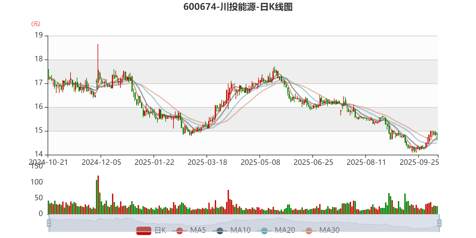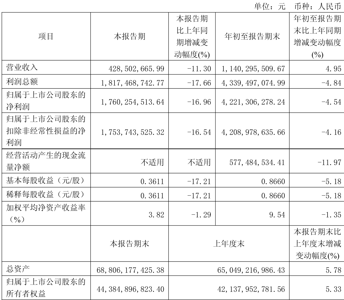 中证智能财讯川投能源(600674)10月21日披露2025年第三季度报告。前三季度公司实现营业总收入11.4亿元,同比增长4.95%;归母净利润42.21亿元,同比下降4.54%;扣非净利润42.09亿元,同比下降4.16%;经营活动产生的现金流量净额为5.77亿元,同比下降11.97%;报告期内,川投能源基本每股收益为0.866元,加权平均净资产收益率为9.54%。
