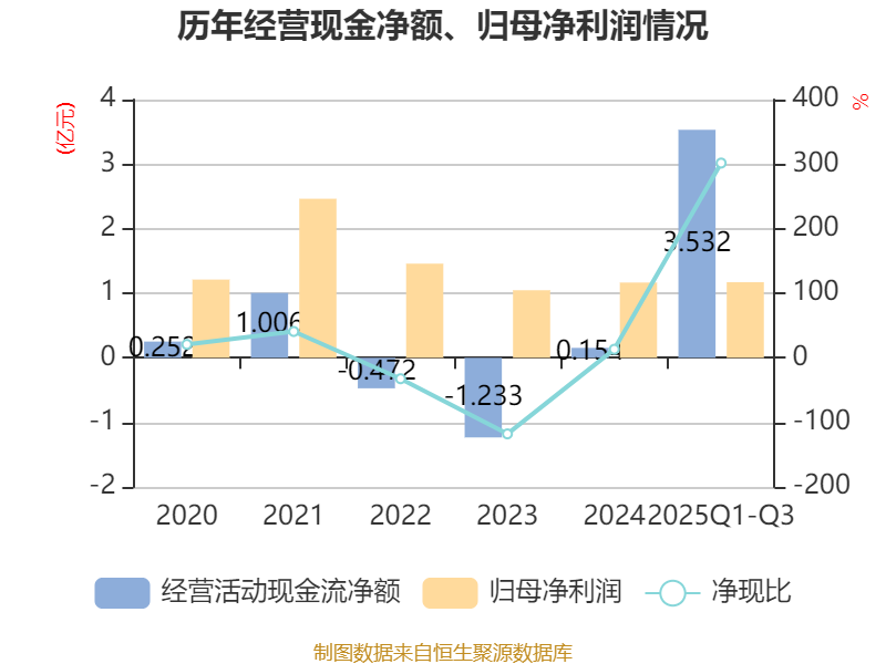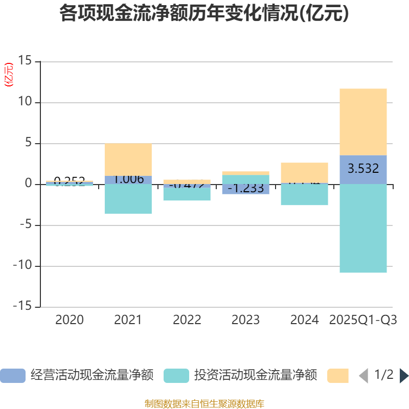 2025年前三季度,公司经营活动现金流净额为3.53亿元,同比下降15.05%;筹资活动现金流净额8.13亿元,同比增加3.82亿元;投资活动现金流净额-10.83亿元,上年同期为-8.74亿元。