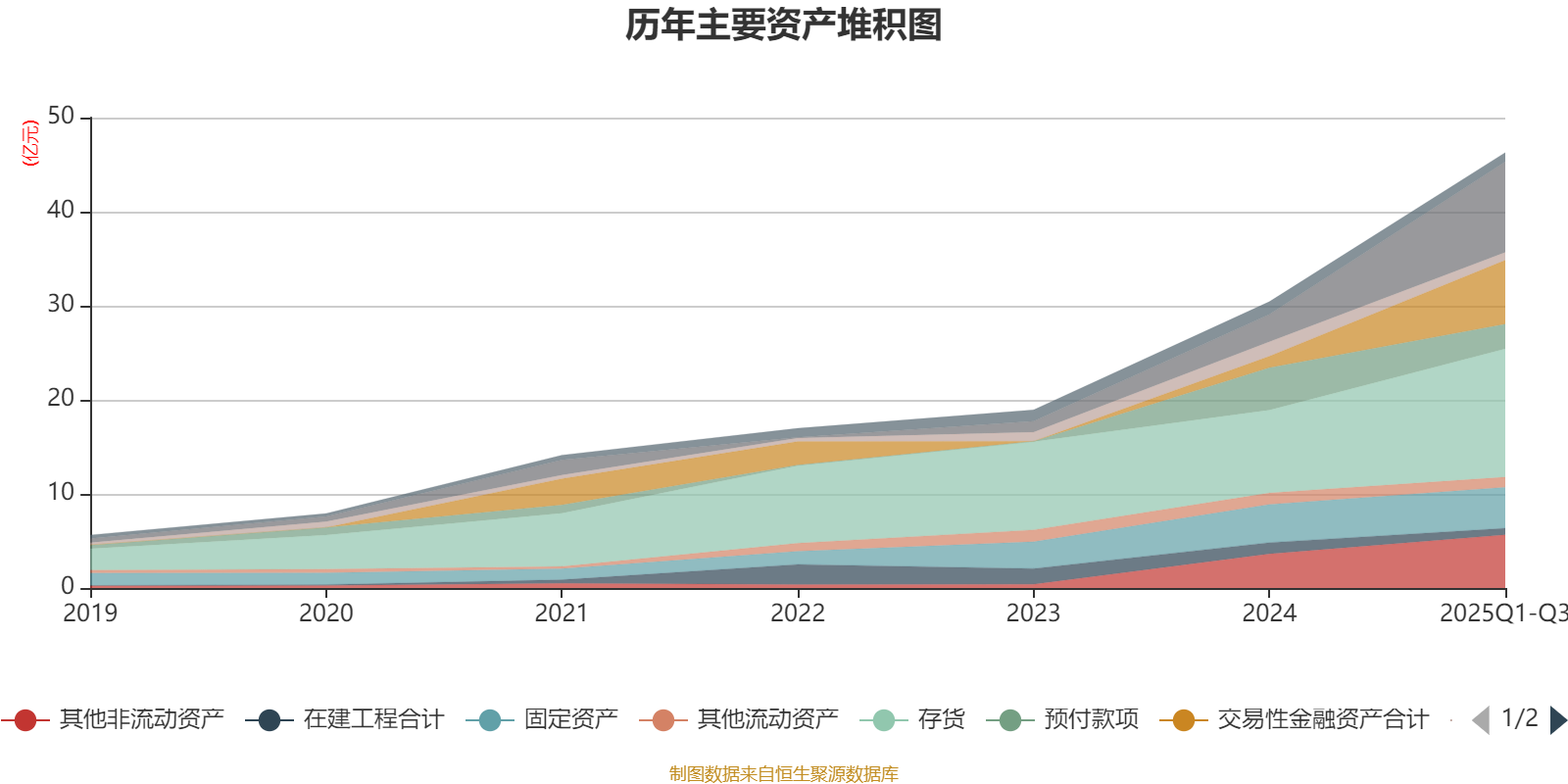 资产重大变化方面,截至2025年三季度末,公司货币资金较上年末增加232.56%,占公司总资产比重上升11.3个百分点;交易性金融资产合计较上年末增加462.07%,占公司总资产比重上升10.69个百分点;预付款项较上年末减少41.58%,占公司总资产比重下降9.15个百分点;固定资产较上年末增加7.05%,占公司总资产比重下降3.95个百分点。