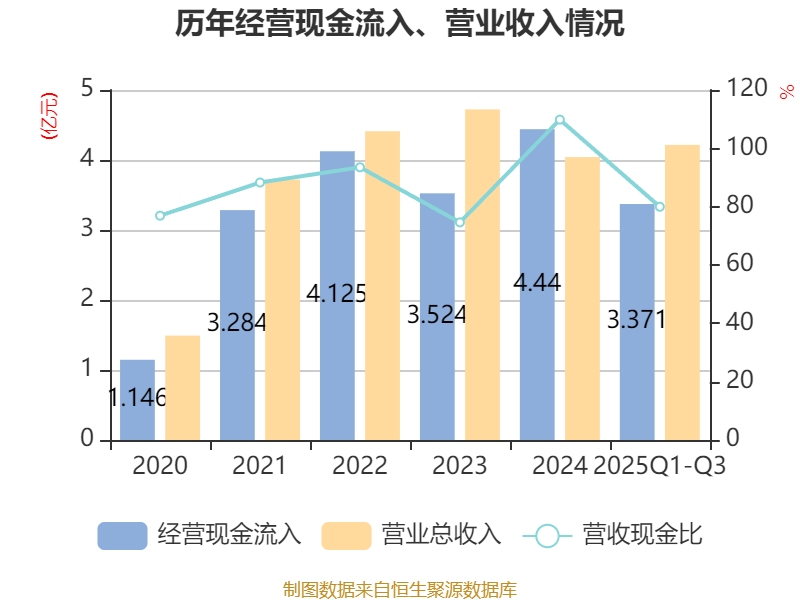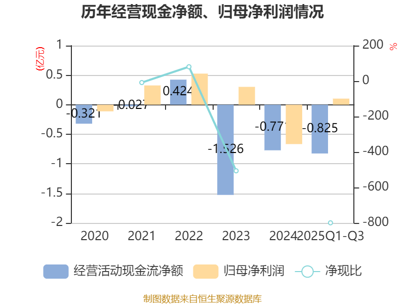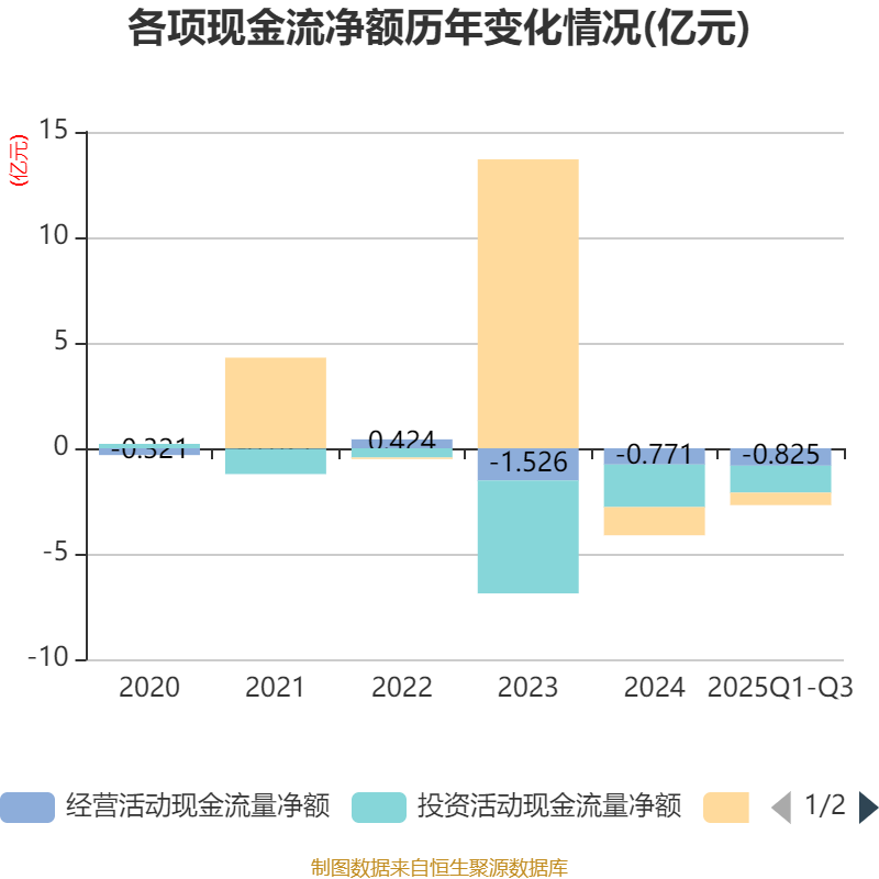 2025年前三季度,公司经营活动现金流净额为-8249.19万元,同比减少3187.46万元;筹资活动现金流净额-5908.14万元,同比增加4326.61万元;投资活动现金流净额-1.28亿元,上年同期为-4.8亿元。