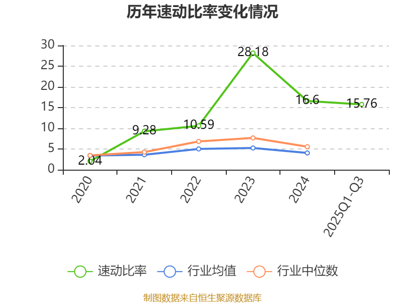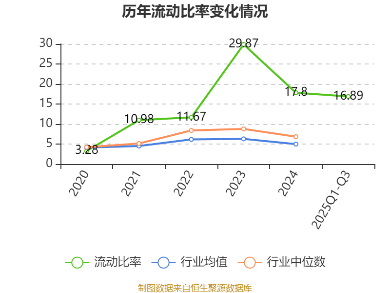 2025年前三季度,公司流动比率为16.89,速动比率为15.76。