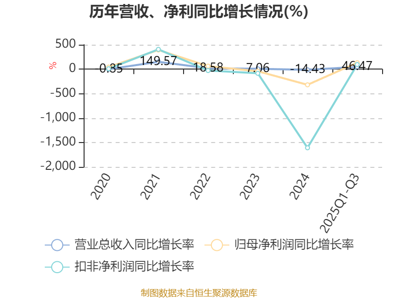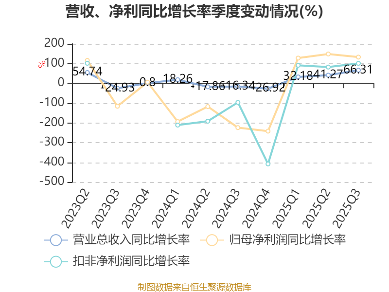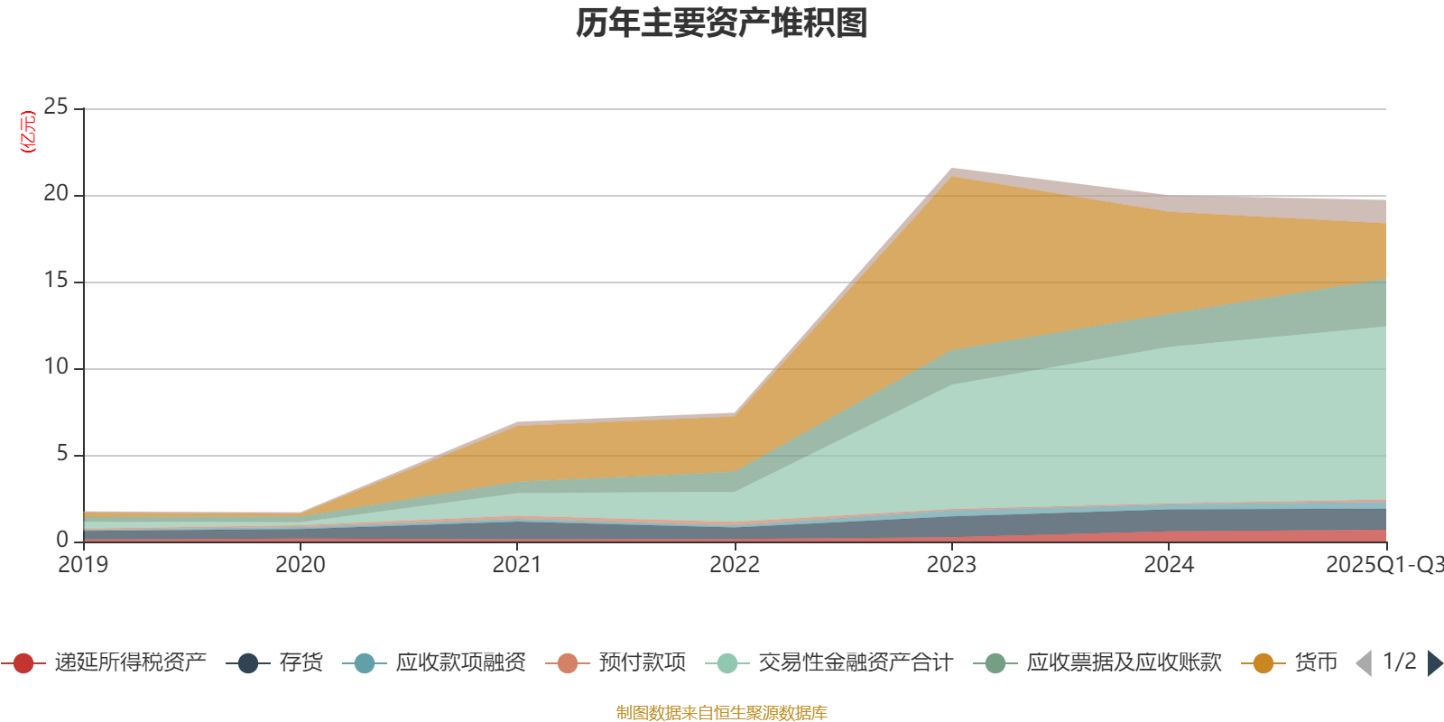 资产重大变化方面,截至2025年三季度末,公司货币资金较上年末减少45.76%,占公司总资产比重下降13.28个百分点;交易性金融资产合计较上年末增加10.81%,占公司总资产比重上升5.57个百分点;应收票据及应收账款较上年末增加43.8%,占公司总资产比重上升4.38个百分点;一年内到期的非流动资产较上年末增加2209.2%,占公司总资产比重上升1.09个百分点。