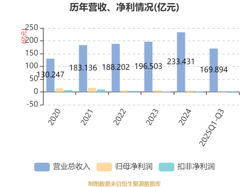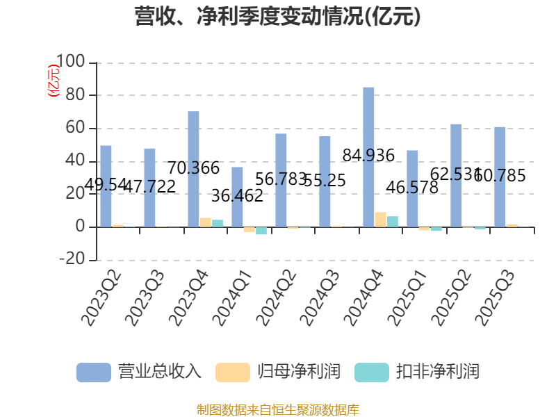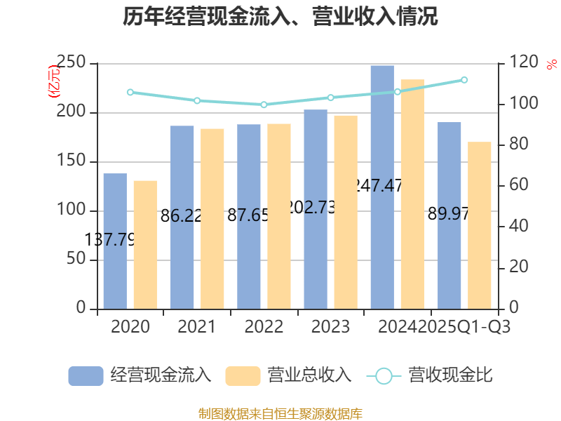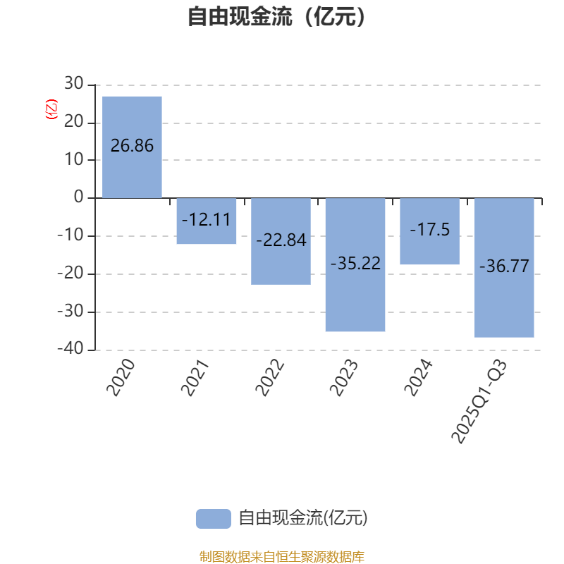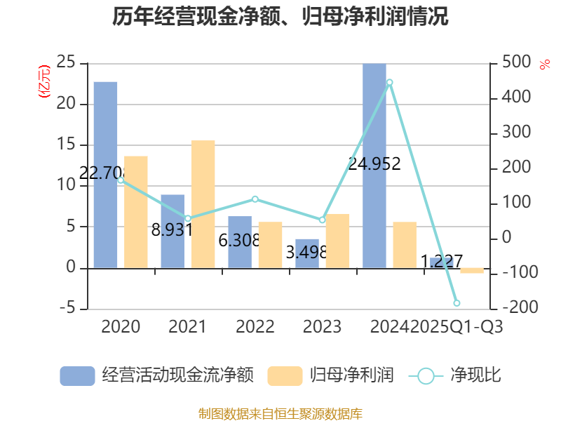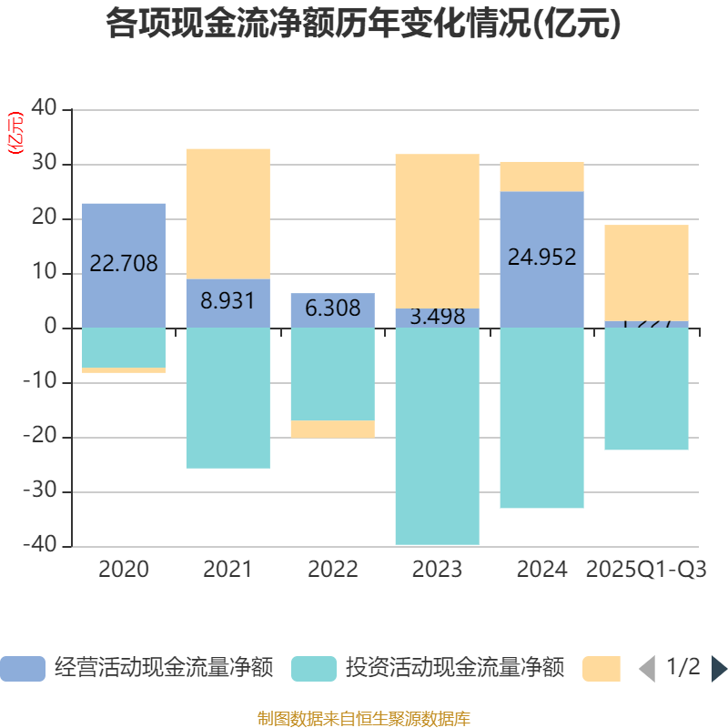 2025年前三季度,公司经营活动现金流净额为1.23亿元,同比增加9.44亿元;筹资活动现金流净额17.59亿元,同比减少6.13亿元;投资活动现金流净额-22.38亿元,上年同期为-23.76亿元。