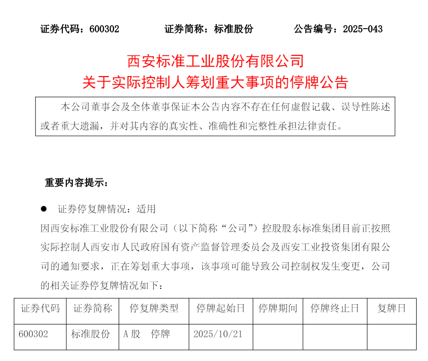 10月20日晚间,西安标准工业股份有限公司(以下简称“标准股份”,证券代码:600302)发布公告称,公司控股股东标准集团目前正按照实际控制人西安市人民政府国有资产监督管理委员会及西安工业投资集团有限公司的通知要求,筹划重大事项,该事项可能导致公司控制权发生变更。为保证公平信息披露,维护投资者利益,避免造成公司股价异常波动,公司股票于10月21日(星期二)起停牌,预计停牌时间不超过2个交易日。