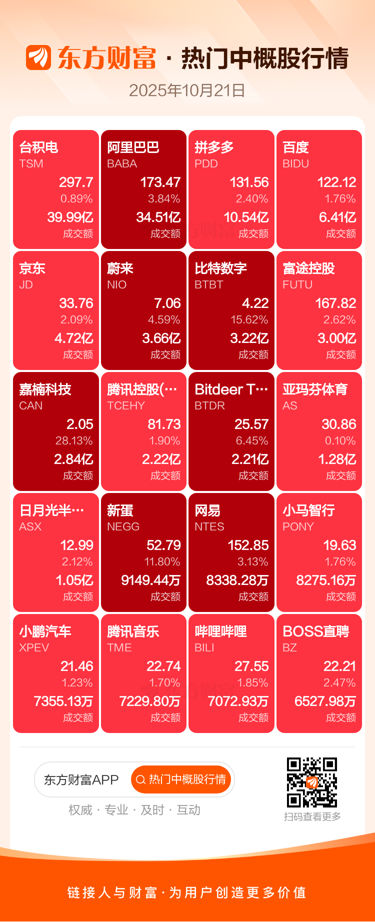 台积电涨0.89%,阿里巴巴涨3.84%,拼多多涨2.40%,百度涨1.76%,京东涨2.09%,蔚来涨4.59%,比特数字涨15.62%,富途控股涨2.62%,嘉楠科技涨28.13%,腾讯控股(ADR)涨1.90%。