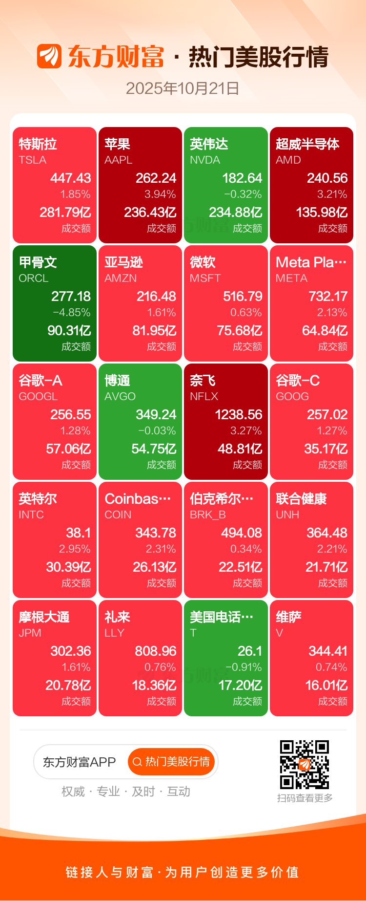 特斯拉涨1.85%,苹果涨3.94%,英伟达跌0.32%,超威半导体涨3.21%,甲骨文跌4.85%,亚马逊涨1.61%,微软涨0.63%,Meta Platforms Inc-A涨2.13%,谷歌-A涨1.28%,博通跌0.03%。