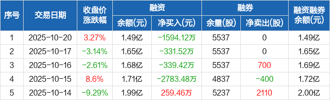 融资方面,当日融资买入1478.93万元,融资偿还3073.05万元,融资净偿还1594.12万元,连续4日净偿还累计5048.54万元。融券方面,融券卖出0股,融券偿还0股,融券余量5537股,融券余额75.57万元。融资融券余额合计1.49亿元。