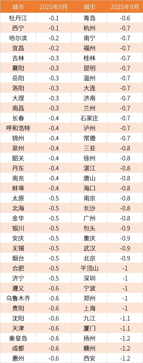 环比跌幅较小的城市为来自西部、东北及部分三四线城市,如牡丹江、西宁、哈尔滨、宜昌等城市,9月环比跌幅不超过0.2%。
