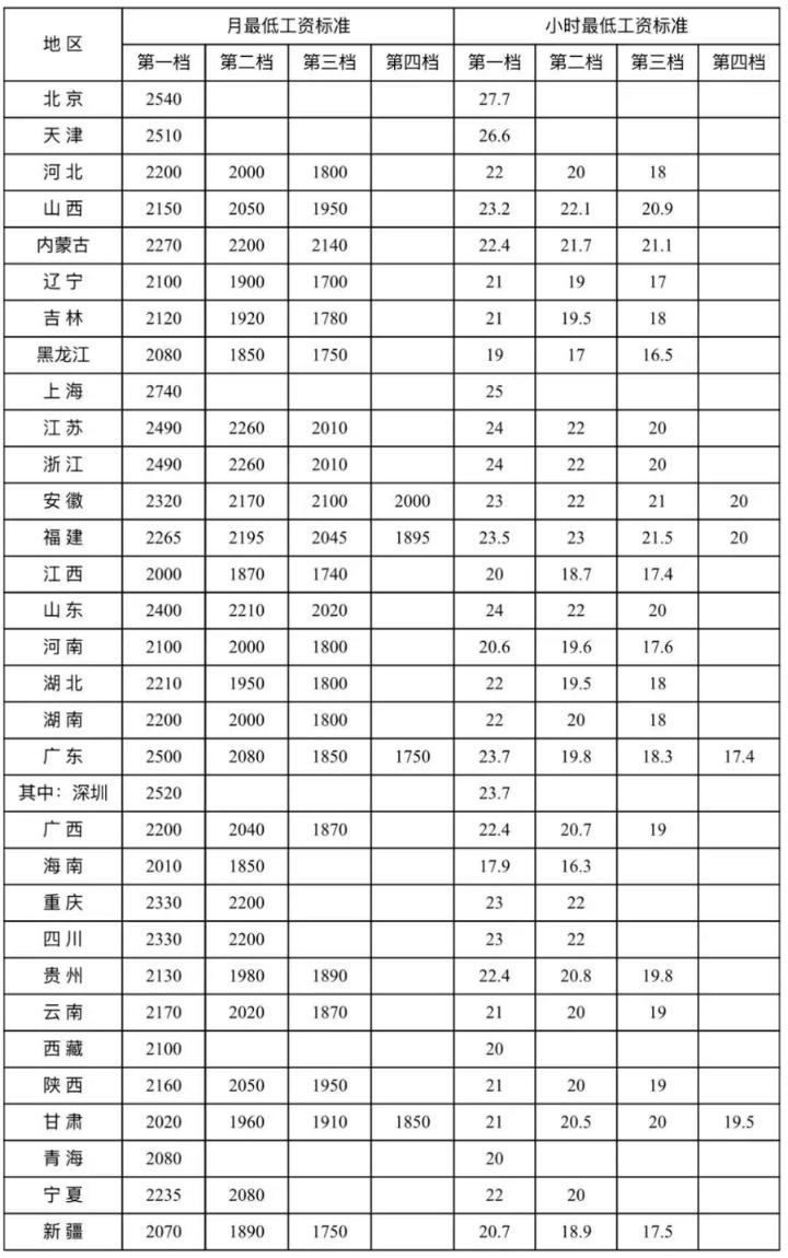 全国最低工资标准公布,月标准上海第一,时标准北京最高