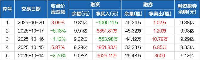 融资方面,当日融资买入4086.84万元,融资偿还5086.95万元,融资净偿还1000.11万元。融券方面,融券卖出2.75万股,融券偿还1.73万股,融券余量46.34万股,融券余额710.86万元。融资融券余额合计9.88亿元。