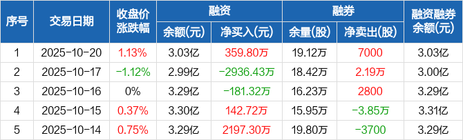 融资方面,当日融资买入2107.31万元,融资偿还1747.51万元,融资净买入359.8万元。融券方面,融券卖出3.15万股,融券偿还2.45万股,融券余量19.12万股,融券余额51.43万元。融资融券余额合计3.03亿元。