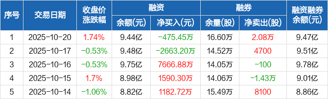云铝股份融资融券信息显示,2025年10月20日融资净偿还475.45万元;融资余额9.44亿元,较前一日下降0.5%。