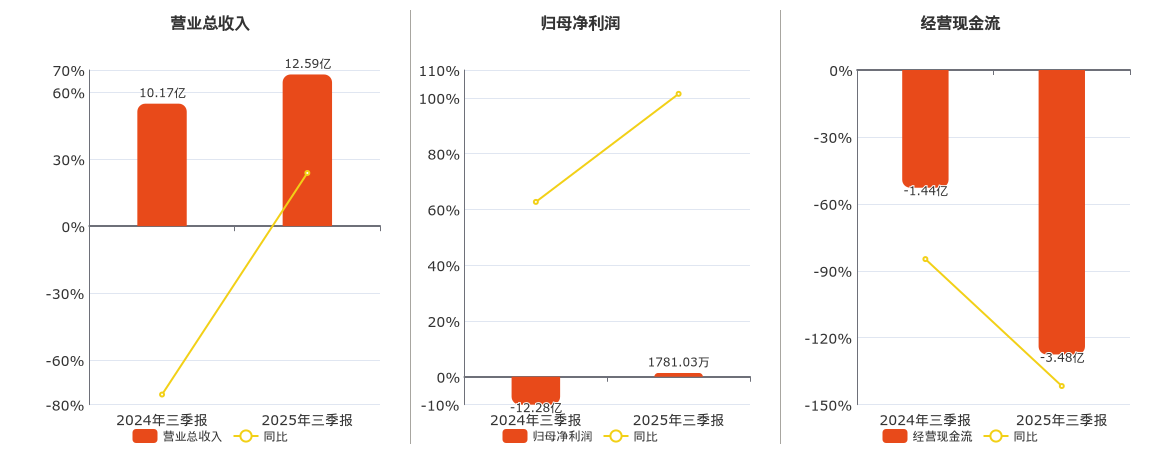 公司营业总收入为12.59亿元,较去年同报告期营业总收入增加2.42亿元,同比较去年同期上涨23.84%。归母净利润为1781.03万元,较去年同报告期归母净利润增加12.46亿元,实现2年连续上涨。经营活动现金净流入为-3.48亿元。