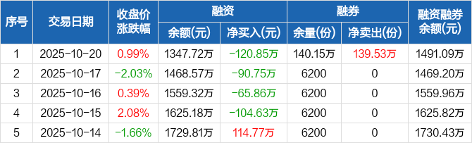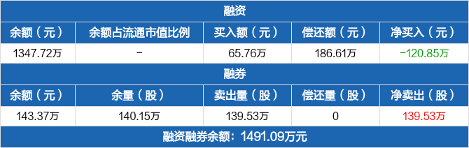 融资方面,当日融资买入65.76万元,融资偿还186.61万元,融资净偿还120.85万元,连续4日净偿还累计382.09万元。融券方面,融券卖出139.53万份,融券偿还0份,融券余量140.15万份,融券余额143.37万元。融资融券余额合计1491.09万元。