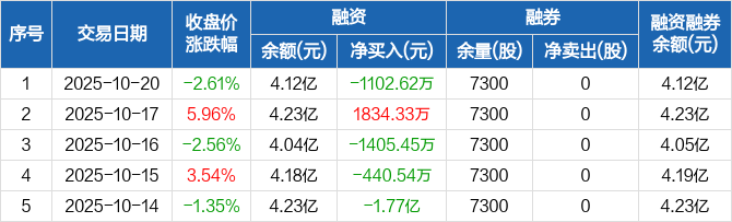 融资方面,当日融资买入2.41亿元,融资偿还2.52亿元,融资净偿还1102.62万元。融券方面,融券卖出0股,融券偿还0股,融券余量7300股,融券余额17.18万元。融资融券余额合计4.12亿元。