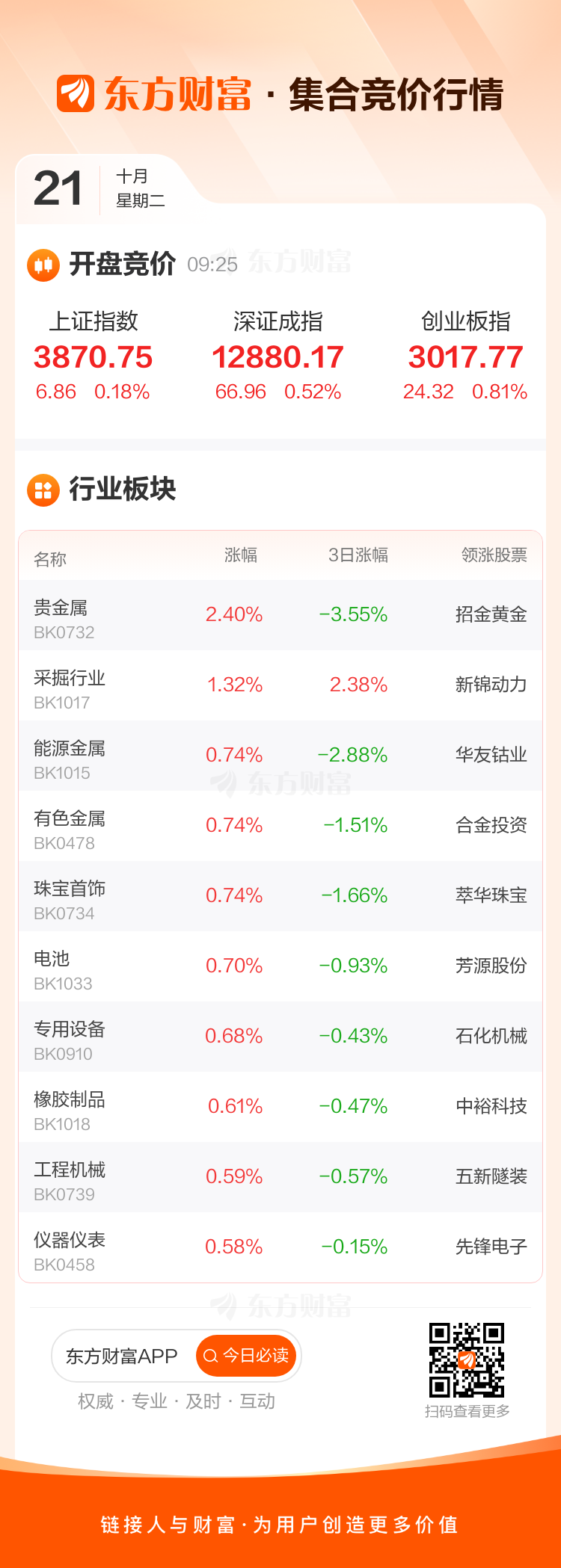 10月21日,三大指数集体高开,上证指数高开0.18%,深证成指高开0.52%,创业板指高开0.81%。板块方面,贵金属领涨,招金黄金涨3.74%,采掘行业、能源金属等开盘涨幅居前。