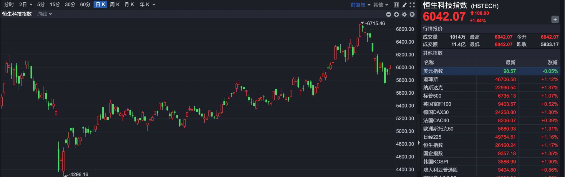 恒生科技指数报6042点,上涨108.90点,涨幅1.84%。