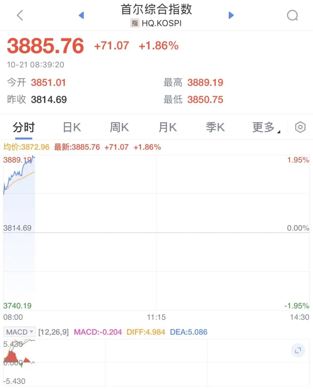此外,韩国股市同样走高,韩国综合指数现涨1.86%。