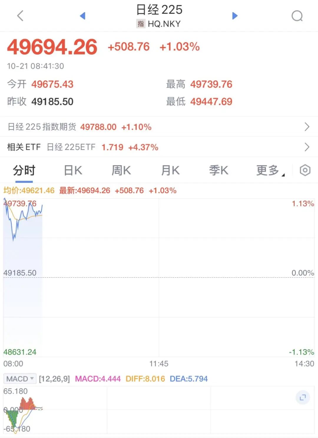 股市方面,10月21日,日经225指数开盘大涨,最新涨1.03%。