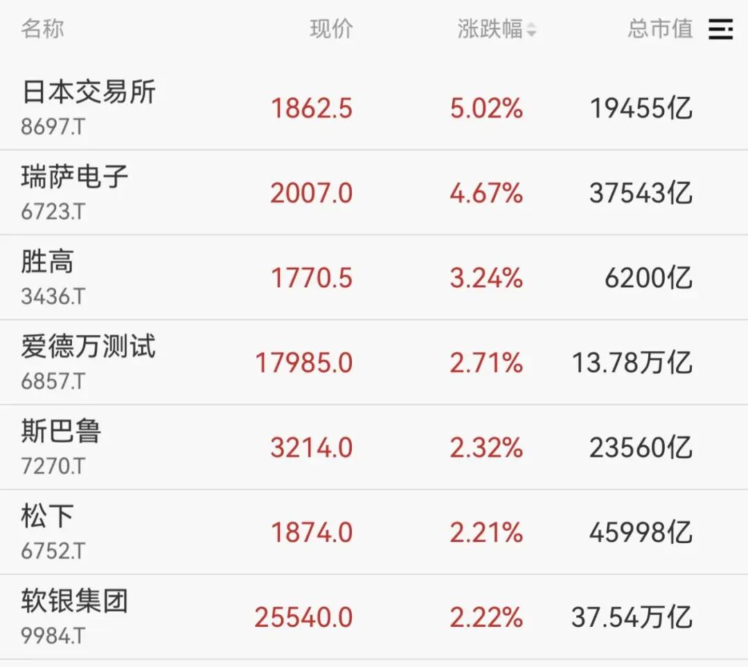 个股方面,日本交易所、瑞萨电子、爱德万测试、软银集团等涨幅居前。
