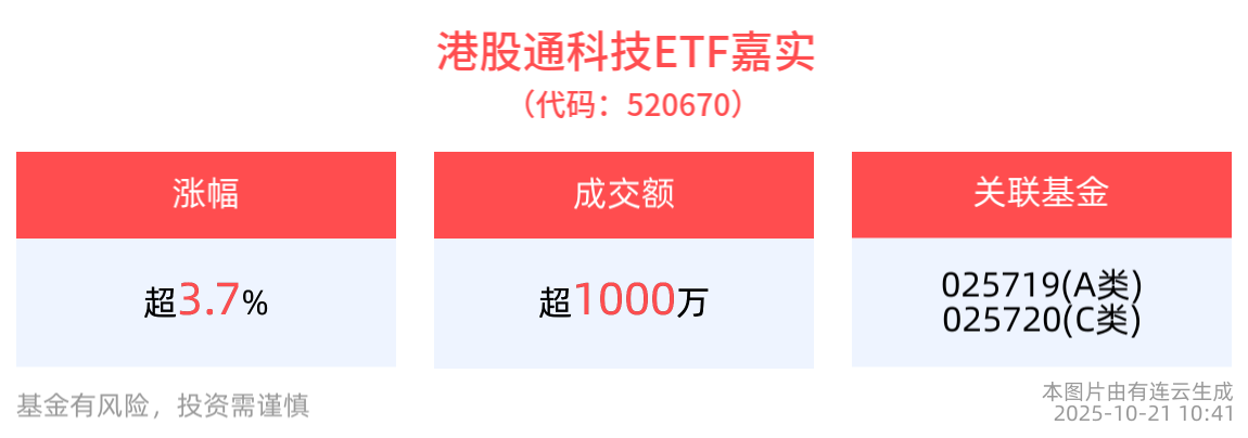 截至2025年10月21日 10:41,港股通科技ETF嘉实(520670)上涨3.71%,盘中换手5.83%,成交1237.26万元。成分股方面,哔哩哔哩-W涨超10%,高伟电子、鸿腾精密涨超7%,瑞声科技、中芯国际等跟涨。