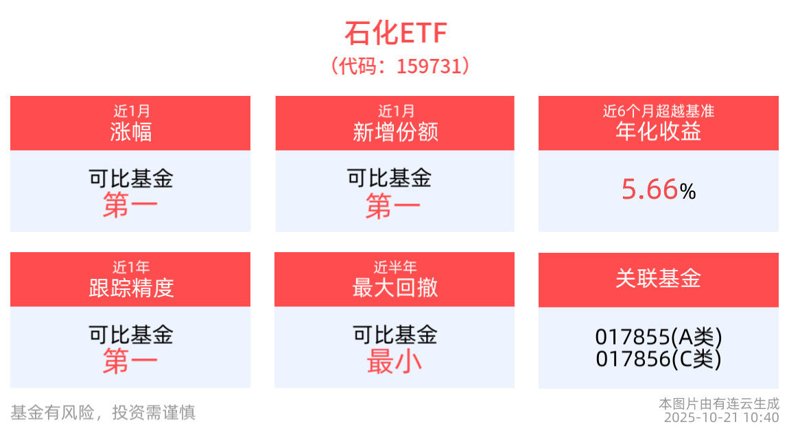 回撤方面,截至2025年10月20日,石化ETF近半年最大回撤6.47%,相对基准回撤0.14%,在可比基金中回撤最小。