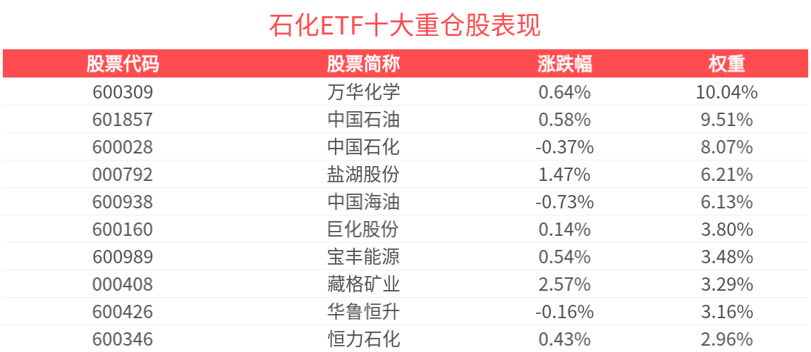 石化ETF紧密跟踪中证石化产业指数,数据显示,截至2025年9月30日,中证石化产业指数前十大权重股分别为万华化学、中国石油、盐湖股份、中国石化、中国海油、巨化股份、藏格矿业、金发科技、华鲁恒升和宝丰能源,前十大权重股合计占比55.12%。