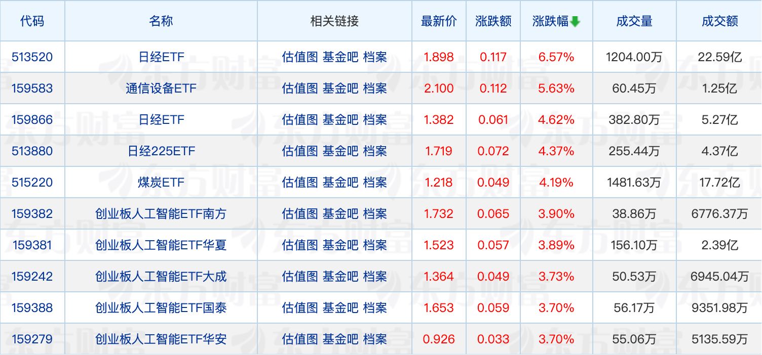 ETF涨跌幅方面,日经ETF涨超6%,通信设备ETF涨超5%。