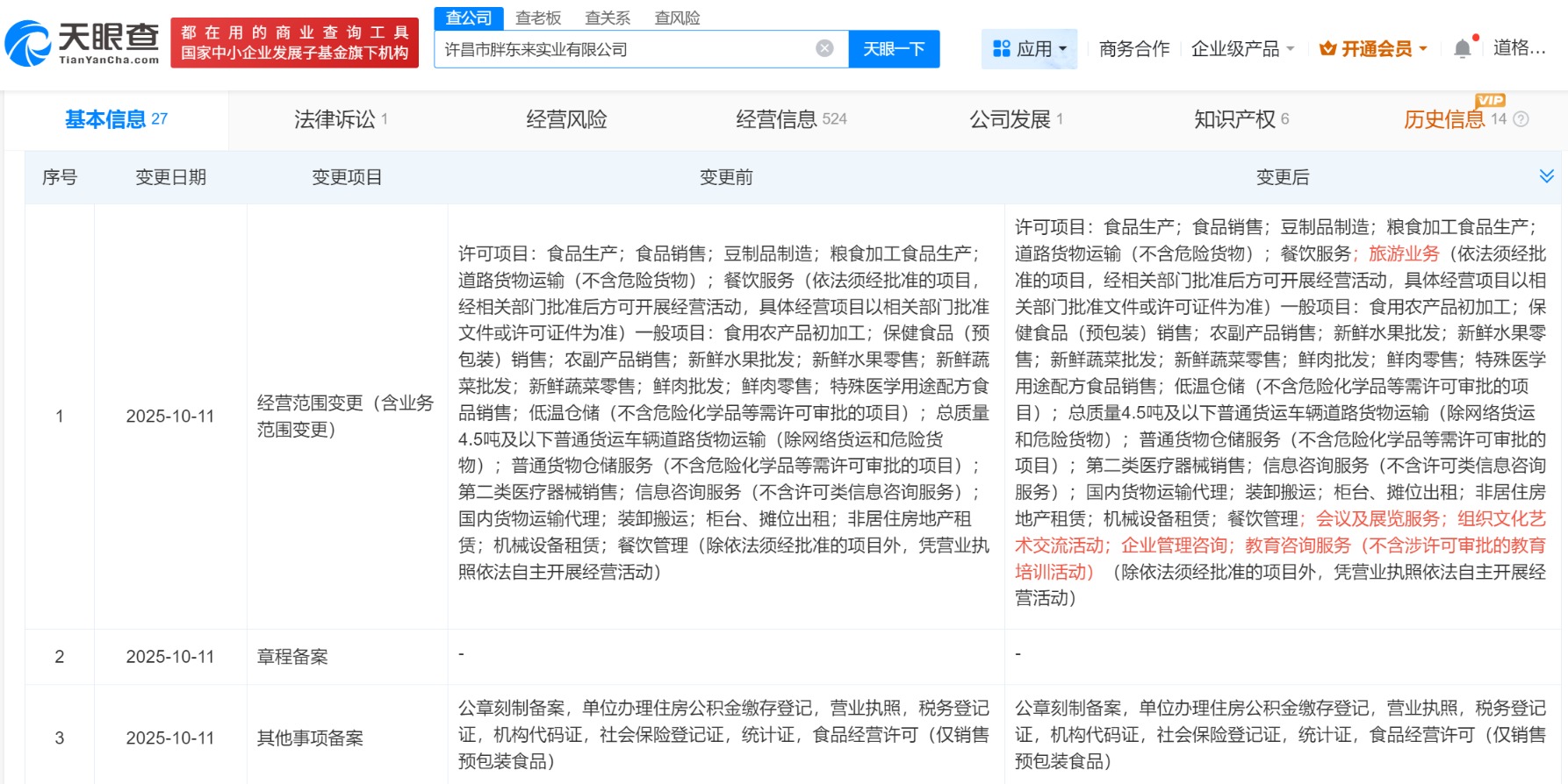 每经AI快讯,10月21日,天眼查App显示,近日,许昌市胖东来实业有限公司发生工商变更,经营范围新增旅游业务、会议及展览服务、组织文化艺术交流活动等。该公司成立于2020年3月,法定代表人为张洪涛,注册资本5000万元,由许昌市胖东来超市有限公司全资持股,后者由许昌市胖东来商贸集团有限公司持股约63%。