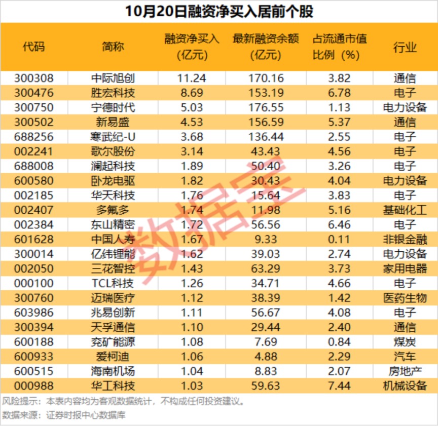 具体到个股,10月20日获融资净买入千万元以上的有386只,其中22只融资净买入额超1亿元。中际旭创融资净买入额居首,当日净买入11.24亿元;其次是胜宏科技、宁德时代,融资净买入金额分别为8.69亿元、5.03亿元;融资净买入金额居前的还有新易盛、寒武纪-U、歌尔股份等。
