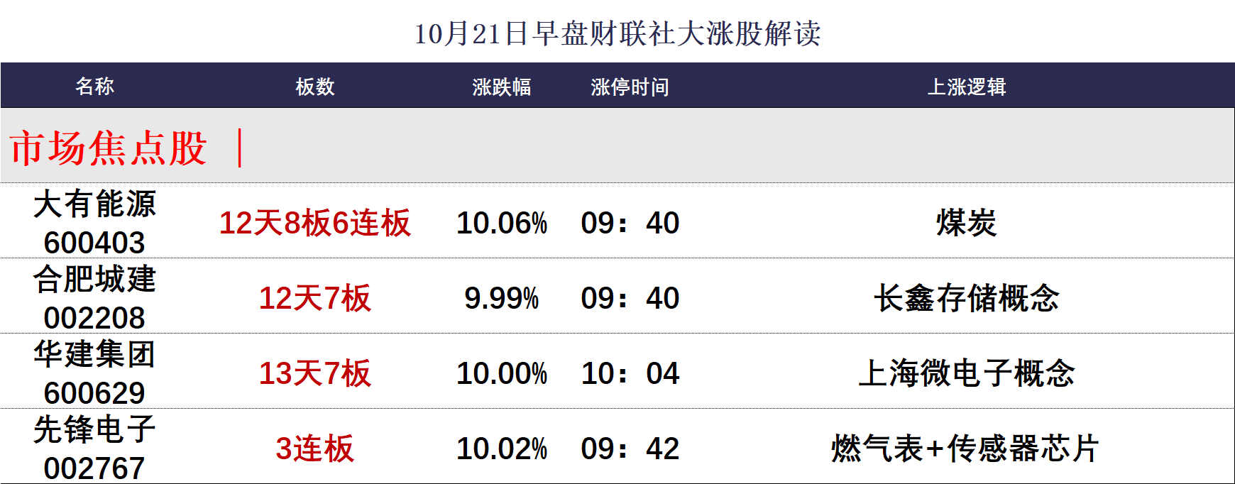 今日午盘全市场共60股涨停,连板股总数12只,10股封板未遂,封板率为86%(不含ST股、退市股)。焦点股方面,大有能源晋级6连板,长鑫存储概念股合肥城建12天7板,上海微电子概念华建集团13天7板。