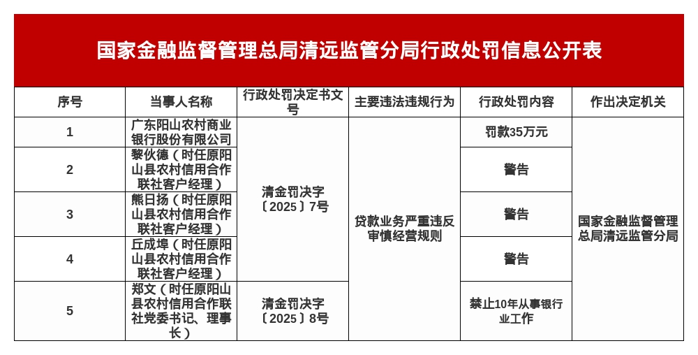 此外,时任原阳山县农村信用合作联社客户经理黎伙德、熊日扬、丘成埠分别被警告;时任原阳山县农村信用合作联社党委书记、理事长郑文,被罚禁止10年从事银行业工作。