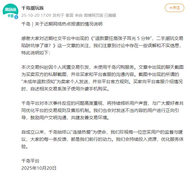 20日,千岛通过其官微回应表示,本次交易纠纷因个人闲置交易引发,未使用千岛闪购服务。文章中出现的聊天截图实为买卖双方的私聊截图,并非买家和平台客服的沟通内容。截图中出现的所谓的“未成年退款须知”为互联网流传的梗图素材,并非平台官方规则。买家向平台客服介绍情况时,自述相关交易系孩子使用外婆手机购买。