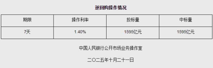 中新网10月21日电据央行网站消息,2025年10月21日中国人民银行以固定利率、数量招标方式开展了1595亿元7天期逆回购操作。具体情况如下: