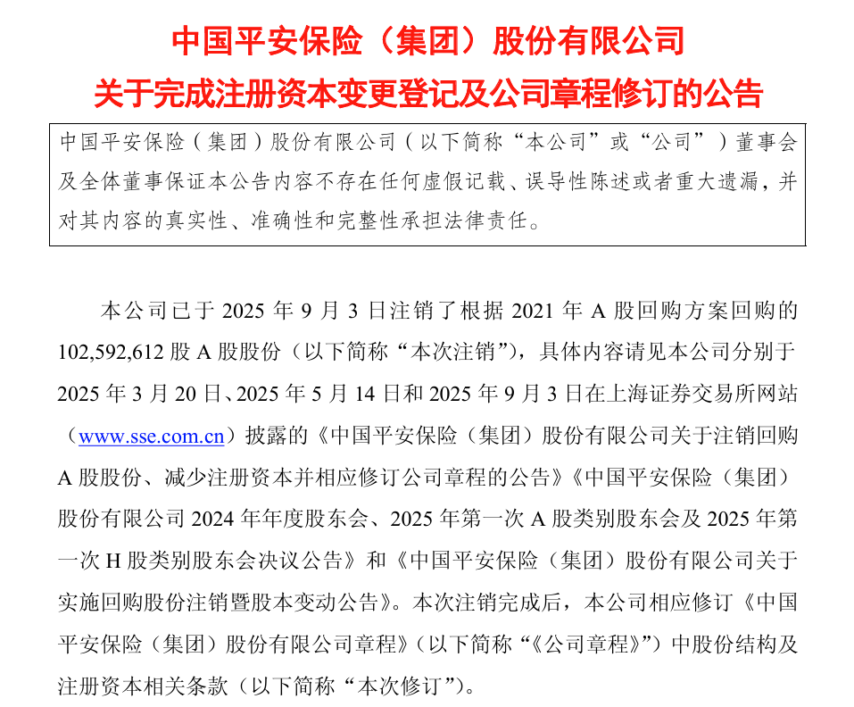 公告显示,中国平安已于2025年9月3日完成2021年A股回购方案项下回购股份的注销,共计注销1亿股A股股份;股份注销后,公司同步启动《公司章程》中股份结构及注册资本相关条款的修订,并于近日在深圳市市场监督管理局完成变更登记与备案,注册资本从原有的182.1亿元调整为181.1亿元。
