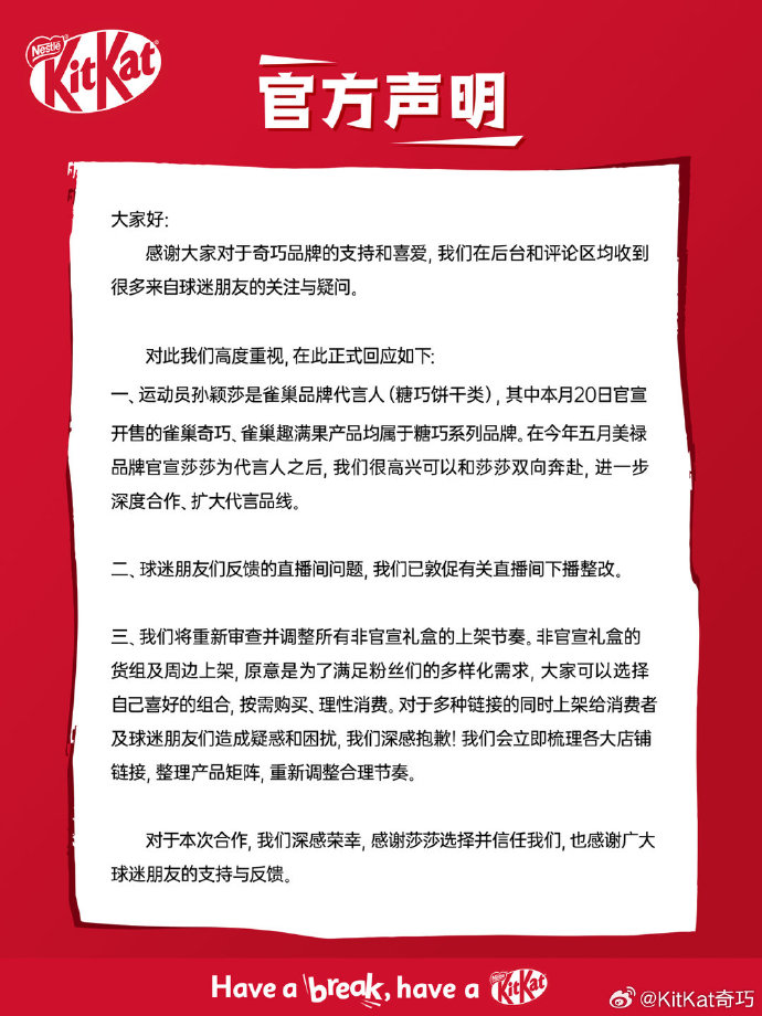 10月21日,瑞士知名食品商雀巢@KitKat奇巧发官方声明称,关于球迷朋友们反馈的直播间问题,已敦促有关直播间下播整改。