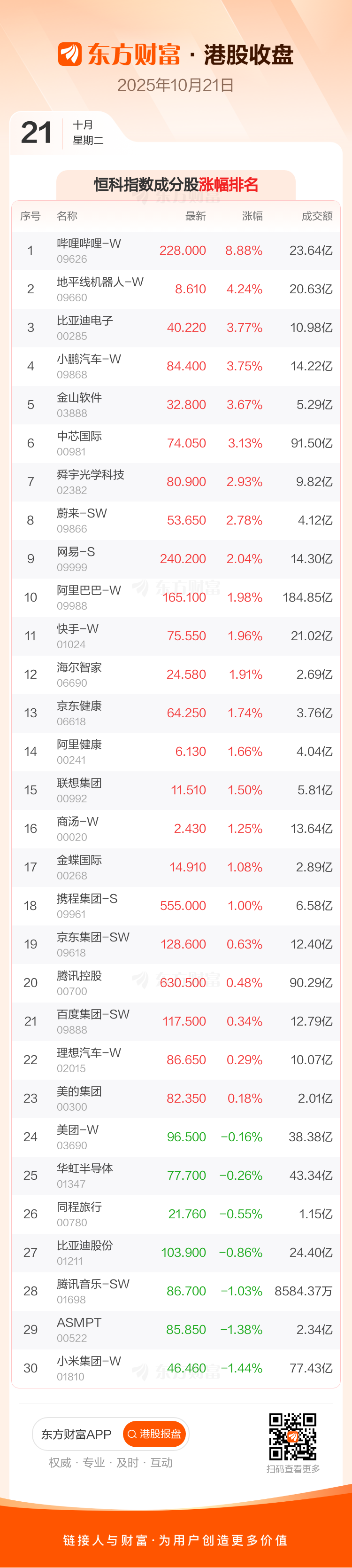 10月21日港股收盘:恒指涨0.65% 科技指数涨1.26%