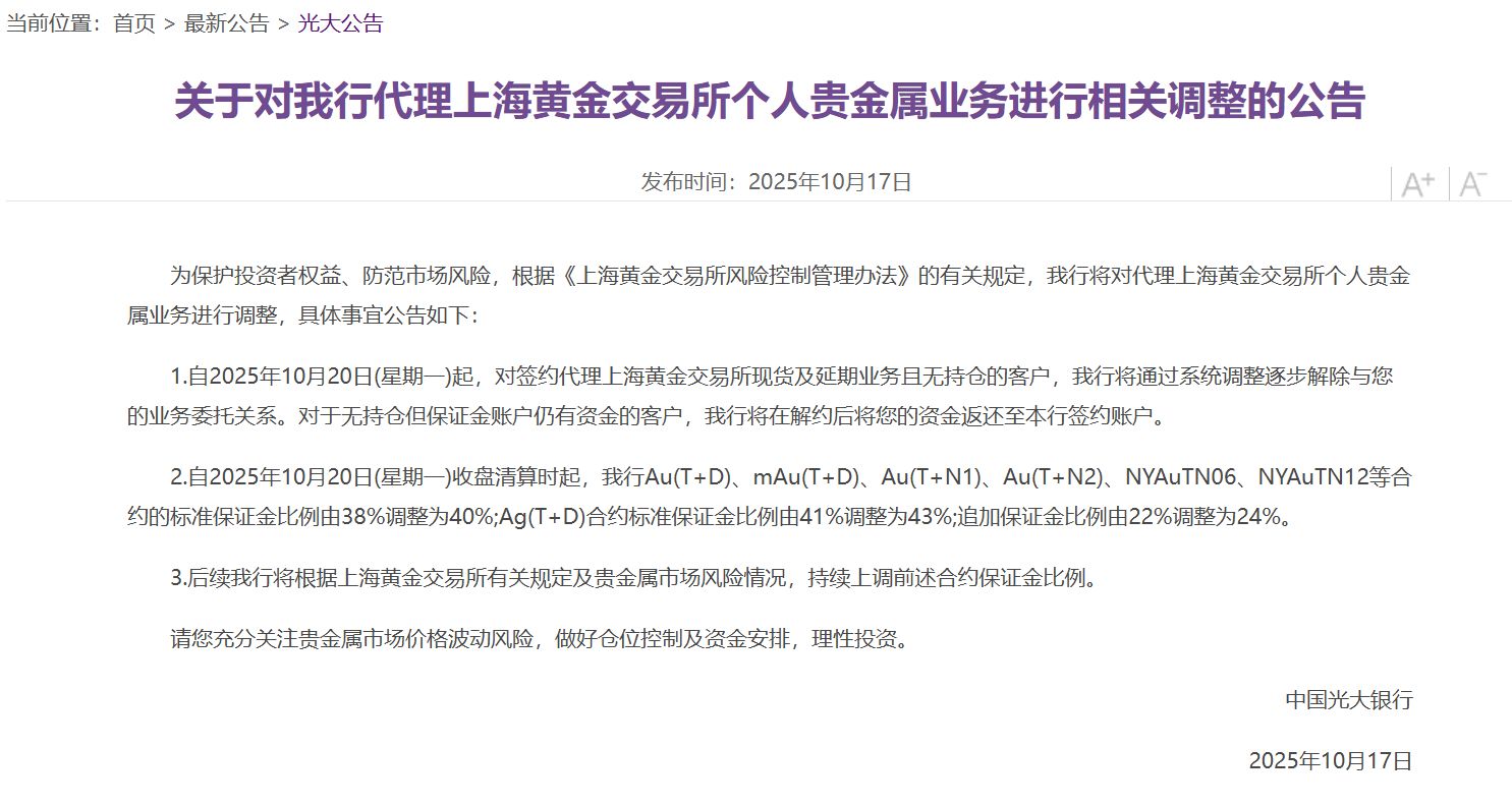 近日,光大银行发文称,自10月20日(星期一)起,对签约代理上海黄金交易所现货及延期业务且无持仓的客户,该行将通过系统调整逐步解除业务委托关系。同时,光大银行还将调整合约保证金。